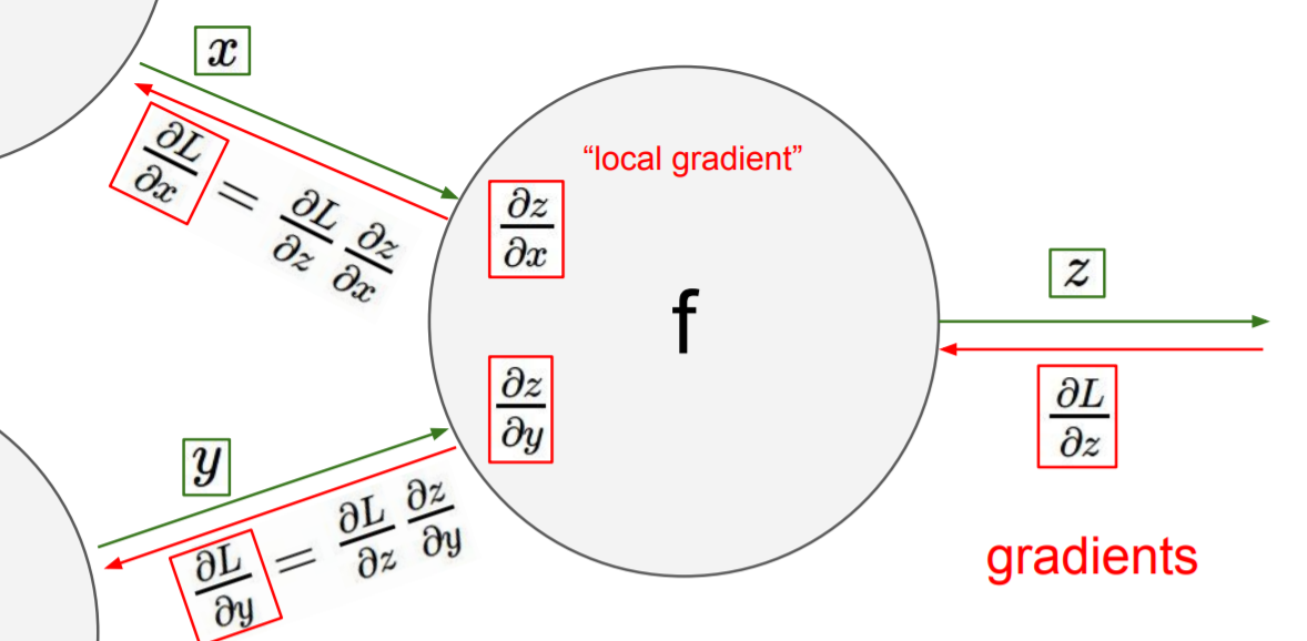 local gradient를 구할 수도 있다 (들어오는 입력에 대한 출력의 기울기: z에서 x에 대한 gradient를 구할 수 있으며 y에 대한 gradient). 각 노드는 local 입력을 받고 밑에 보이는 것처럼 다음 노드로 출력값을 보낸다.