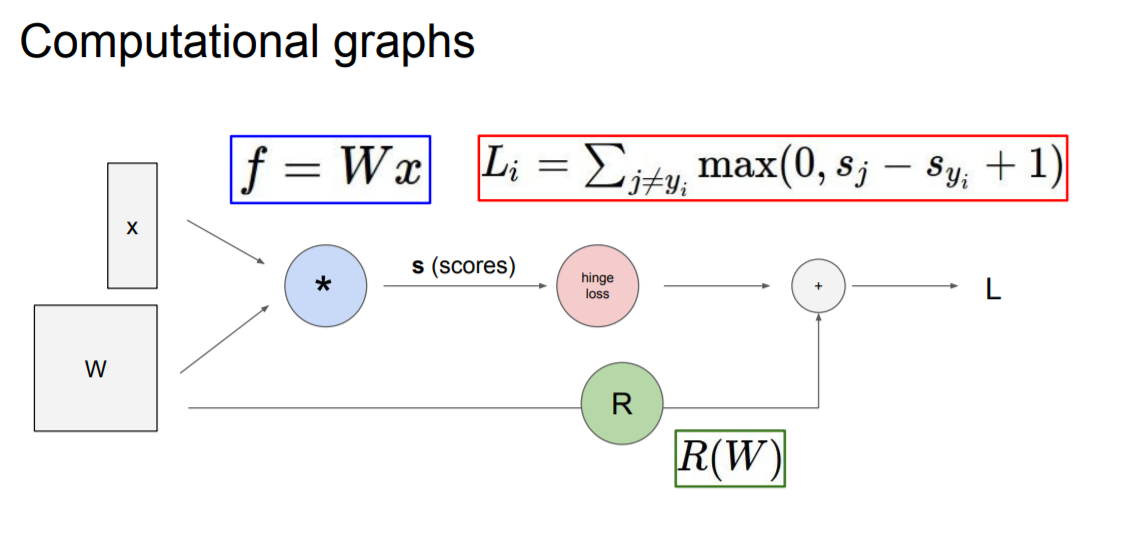 computational graph는 그래프를 이용해서 어떤 함수든지 표현할 수 있게 해준다. 그래프의 각 노드는 연산 단계를 나타낸다. 밑에 예제는 input이 x, W인 선형 classifier이다. hinge loss라는 계산노드를 통해 데이터 항 Lᵢ를 계산한다. 노드 R은 regularization 항을 우리의 최종 loss는 L은 regularization 항과 데이터 항의 합이다. computational graph를 사용해서 함수를 표현하게 됨으로써 우리는 backpropagation이라고 부르는 기술을 사용할 수 있게 되었다.