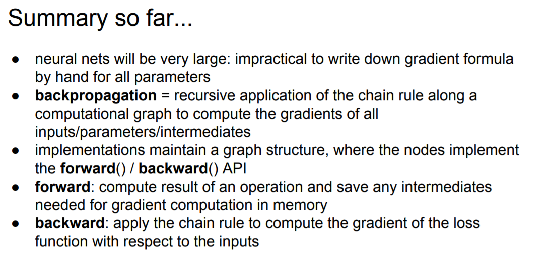 Backpropagation는 신경망의 핵심 기술이고, gradient를 구하기 위해서 backpropagation을 썼다. Backpropagation는 computational graph에서 chain rule을 재귀적으로 적용한 것이다. forward pass에서 우리는 연산 결과를 계산하고 결과를 저장한다. 이것은 나중에 우리가 gradient를 계산할 때 backward pass에서 chain rule을 사용하기 위한 것이고 upstream gradient와 저장한 값들을 곱해 각 노드의 input에 대한 gradient를 구하고 그것들을 연결된 이전 노드로 통과시킨다.