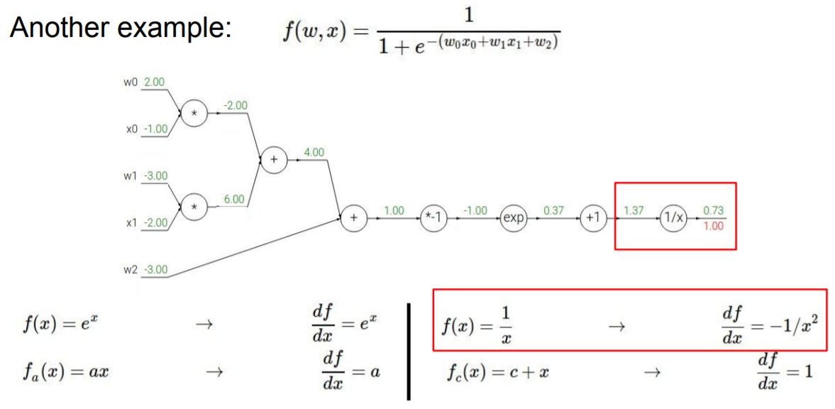 Backpropagation의 다른 예제를 보자. 여기에서 최종 변수에 대한 출력의 gradient는 1이다. 이제 뒤로 한 스텝 간다. 1/x 이전의 input에 대한 gradient는 얼마일까? upstream gradient는 1이다. 우리가 가지고 있는 f는 1/x 이고, 이것의 local gradient인 x에 대한 f의 미분은 -1/x^2와 같다 (빨간 박스 참고). 그래서 우리는 -1/x^2를 x에 대입한다. (x)은 1.37이고,이 변수에 대한 우리의 최종 gradient는 1/-1.37^2 * 1 = -0.53이다.