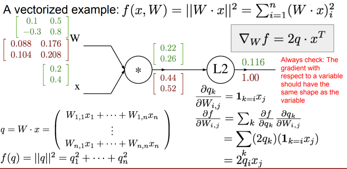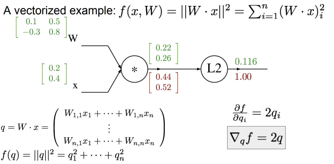 이제 computational graph보다 구체적인 벡터화 된 예제를 보자. x와 W에 대한 함수 f는 x에 의해 곱해진 W의 L2와 같다. 그리고 이 경우 x를 n-차원이라고 하고, W는 n*n이라고 한다. 최종출력에 대한 gradient는 1이다. 이것은 항상 첫 단계이다.
