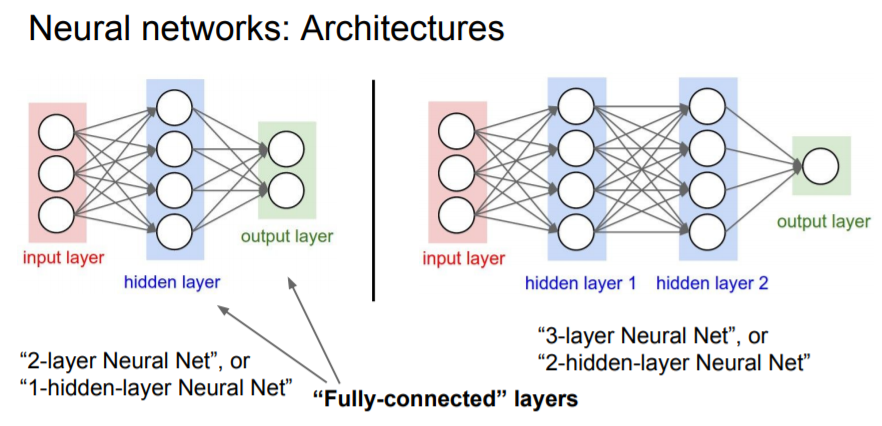 위에 식은 선형 변환식이고 다른 하나는 2층짜리 신경망의 레이어이다. 위에는 W1과 x의 행렬 곱이고 우리는 이것의 중간값을 얻고 max(0, W)라는 비선형 함수를 이용해 선형 레이어 출력의 max를 얻는다. 선형 레이어들을 쌓는다면 그것들은 결국 선형 함수가 되기 때문에 비선형 변환은 매우 중요하다. 밑에 예제를 보면 우리는 첫번째 선형 레이어를 가지고 있고 그 다음 비선형 레이러를 가지고 있다 그리고 그 위에 선형 레이어를 추가함으로 최종적으로 score 함수를 얻을 수 있다. 신경망은 함수들의 집합(class)이다. 비선형의 복잡한 함수를 만들기 위해서 간단한 함수들을 계층적으로 여러개 쌓아올린 것이다 (계층적 계산).