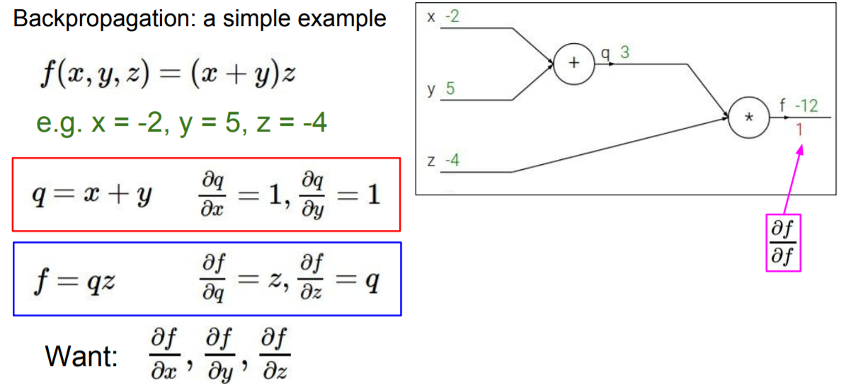 밑에 예제는 backpropagation의 간단한 예제이다. 이 경우 x,y,z로 구성된 function f는 (x+y)*z와 같다. 그리고 우리는 f의 출력에 대한 어떤 변수의 gradient를 찾기 원한다. 첫번째 단계는 항상 함수 f를 computational graph로 나타내는 것이다. x는 -2, y는 5, z는 -4이고 최종 노드를 통과하면 -12를 얻는다. 이 때 모든 중간 변수에 이름을 줄 것이다. x+y 덧셈 노드를 q라고 부르고 f는 q*z가 된다. q와 z에 대한 f의 gradient는 곱셈규칙에 의해 각각 z와 q이다. backpropagation은 chain rule의 재귀적인 응용으로 chiain rule에 의해 뒤에서부터 시작한다.