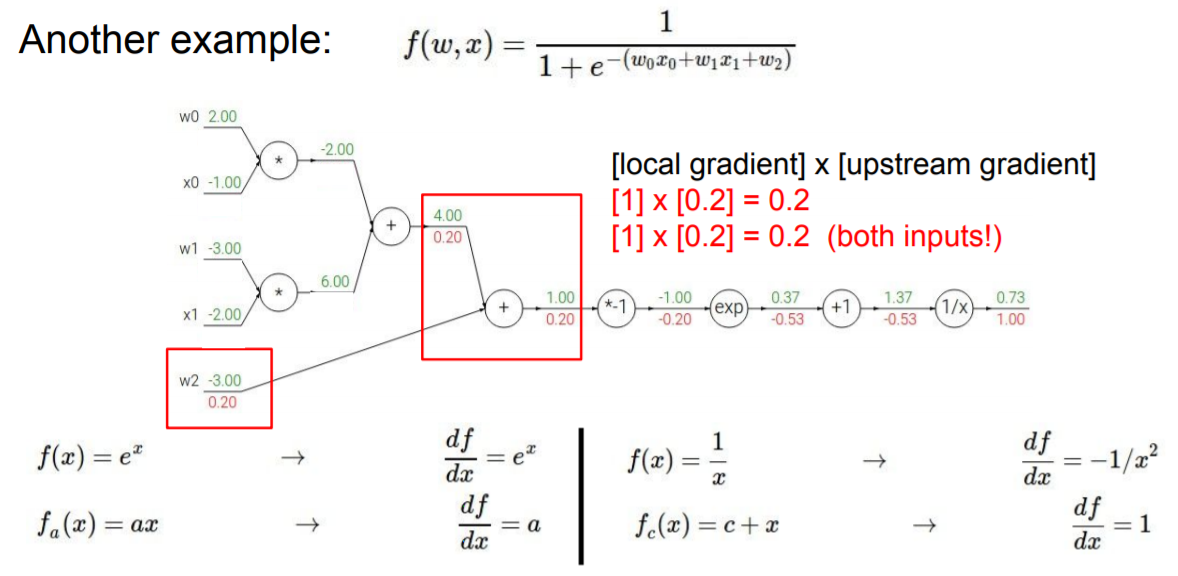 한 단계 더 진행해보면 upstream gradient는 -0.53이고 local gradient는 exponential 노드에서, chain rule에 의해 gradient가 -0.53*e^x임을 알 수 있다. (x의) 값이 -1인 경우 (exponential 노드에서) 최종 gradient는 -0.2이다.