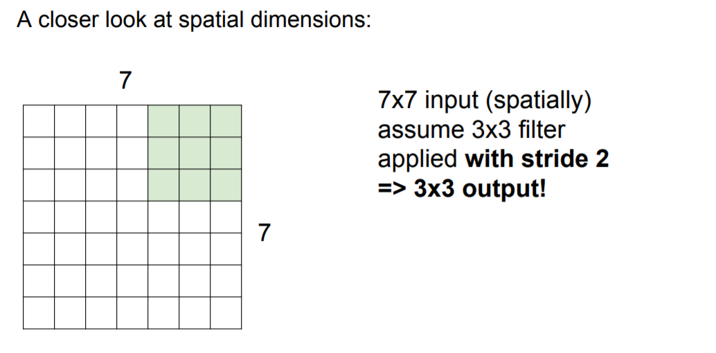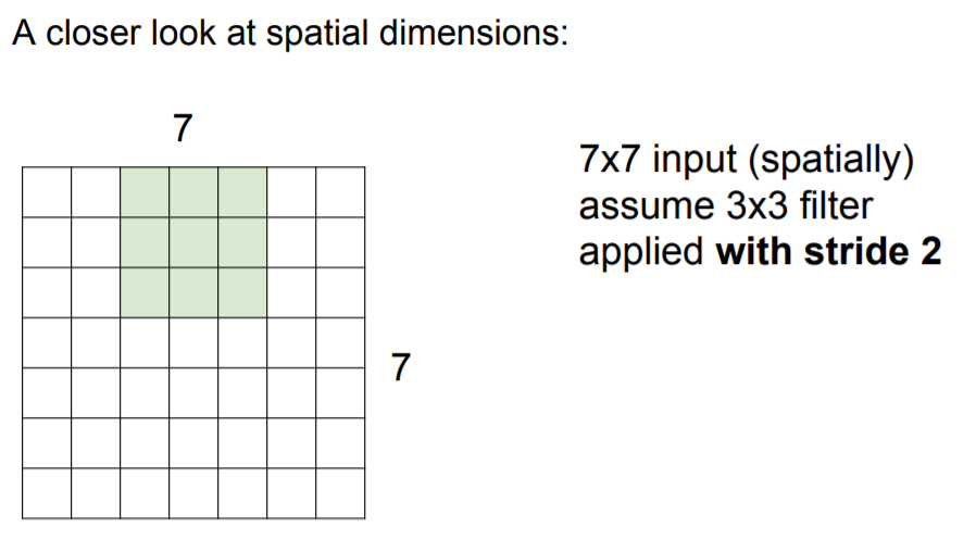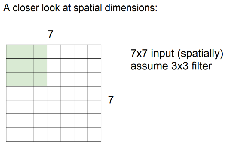 32 x 32 x 3 이미지가 있고 이 이미지를 5 x 5 x 3 필터를 가지고 연산을 수행할 때, 어떻게 28 x 28 activation map이 생기는지 알아보자. 간단한 예시로 7 x 7 입력에 3 x 3 필터가 있다고 했을 때 우리는 이 필터를 가장 왼쪽 상단에 위치시키고 해당 값들의 내적을 수행한다. 이 값들은 activation map의 좌 상단에 위치할 것이다. 그리고 다음 단계로 필를 오른쪽으로 한칸 움직인다. 그러면 또 하나의 값을 얻을 수 있고, 계속 반복하다보면 결국 5 x 5의 출력을 얻게 된다. 왜내하면 이 슬라이드 필터는 좌우 방향으로는 5번만, 상하 방향으로도 5번만 수행가능하기 때문이다. 우리는 필터 슬라이딩을 한칸씩 진행했는데, 이때 움직이는 칸을 stride라고 한다.