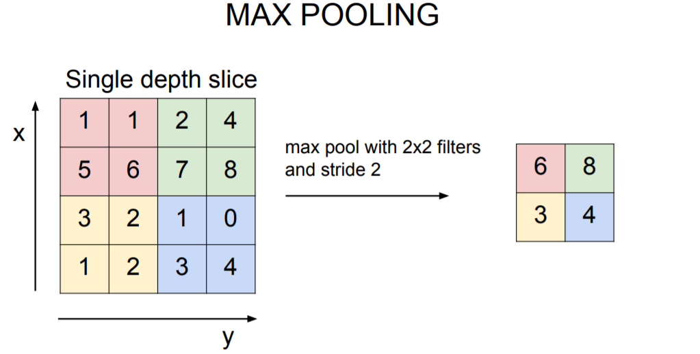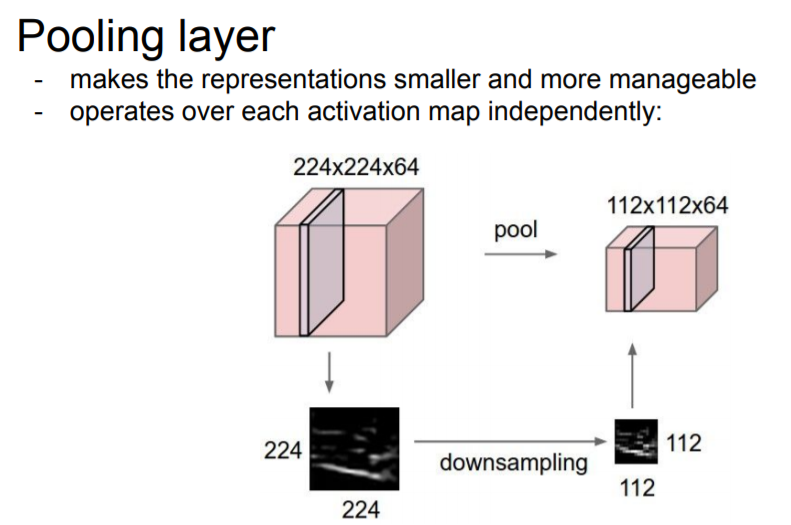 CNN에는 Conv Layer와 Pooling Layer, 그리고 다른 비선형 연산들도 있다. Pooling Layer는 Representation들을 더 작고 관리하게 쉽게 해준다. Representation을 작게 만드는 이유는 파라미터의 수가 줄게 되고, 공간적인 불변성(invaiance) 을 얻을 수도 있다. Pooling Layer가 하는 일은 아주 간단한데, downsample하는 것이다. 예를 들어, 224 x 224 x 64 인 입력이 있다면, 이를 112 x 112 x 64 로 공간적으로 줄여준다. 여기서 중요한 점은 depth (깊이)에는 영향을 주지 않는다.