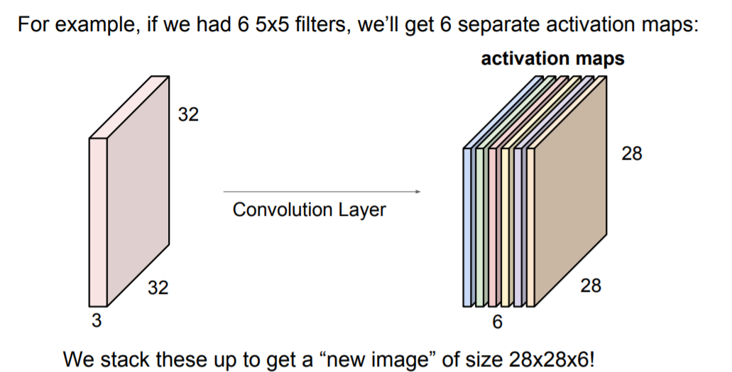 보통 Convolution Layer에서는 여러개의 필터를 사용하는데, 필터마다 다른 특징을 추출하고 싶기 때문이다. 예를 들어, 두 번째 필터인 초록색의 5 x 5 x 3 필터를 연산하고 나면, 앞서 계산했던 activate map과 같은 크기의 새로운 map이 만들어 진다. 한 Layer에서 원하는 만큼 여러개의 필터를 사용할 수 있다. 아래 그림과 같이 5x5 필터가 6개가 있다면 총 6개의 activation map을 얻게 되는 것이다.