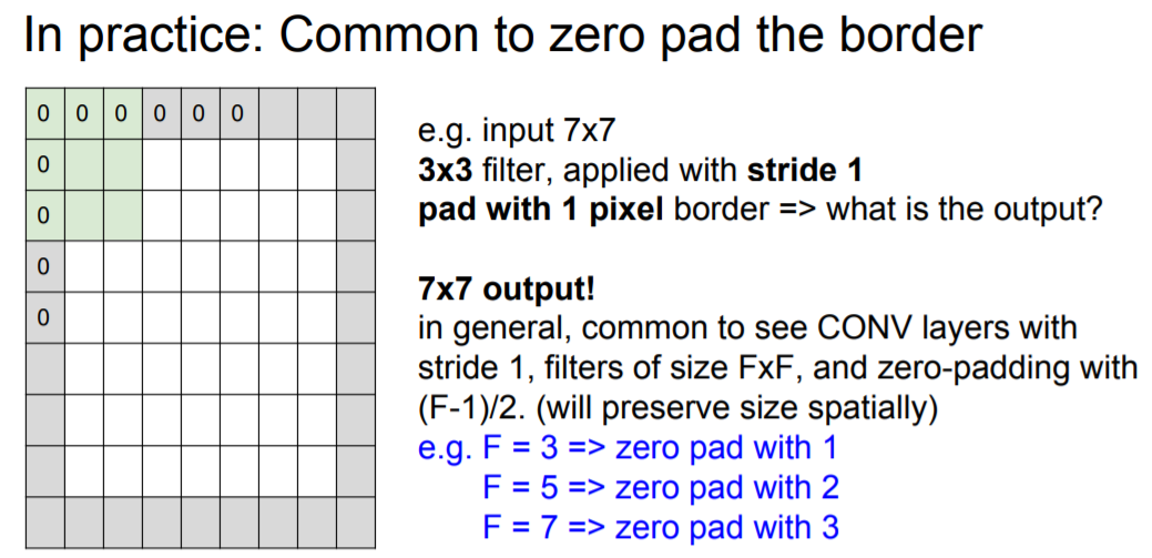 Zero-padding은 가장자리의 필터 연산을 수행하도록 하고 출력의 사이즈 의도대로 만들어 준다. 이는 입력 사이즈를 유지할 수 있고 코너를 처리할 수도 있다. Zero-padding은 이미지의 가장자리에 0을 채워넣음으로써 왼쪽 상단의 자리에서도 필터 연산을 수행할 수 있게 된다. Zero-padding을 하면 새 출력이 7이 되어 출력의 차원이 입력의 차원과 같아진다. 출력은 (7 x 7 x 필터의 개수)가 된다.