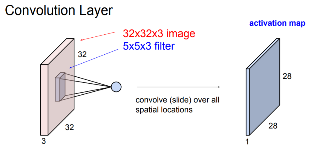 필터가 슬라이딩 할 때, Convolution은 이미지의 좌상단부터 시작한다. 필터의 모든 요소를 가지고 내적을 수행하게 되면 하나의 값을 얻게된다. 그리고 계속 슬라이딩 한다. Conv연산을 수행하는 값들을 다시 Output activation map에 해당하는 위치에 저장된다. 밑에 예시를 보면, 입력 이미지와 출력 activation map의 차원이 다르다는 것을 알 수 있다 (입력은 32 x 32 이고 출력은 28 x 28).