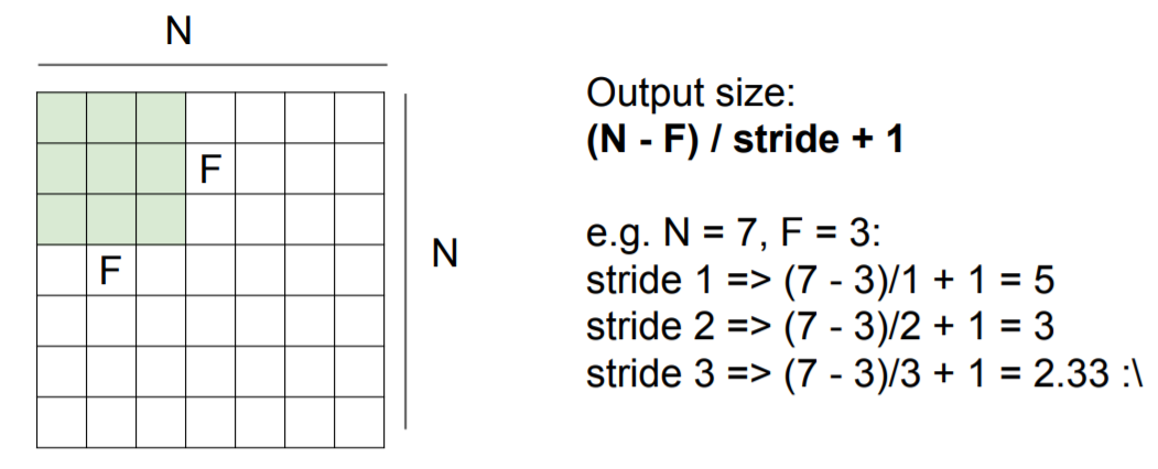 stride = 3인 경우는 이미지를 슬라이딩해도 필터가 모든 이미지를 커버할 수 없다. 이미지에 잘 맞아떨어지지 않으므로 실제로 이렇게 되면 잘 동작하지 않는다고 볼 수 있다. 이로 인해 불균형한 결과를 볼 수도 있기 때문에 이렇게 stride값을 설정하면 안된다. 이런 상황을 방지하기 위해 출력의 사이즈가 어떻게 될 것인지를 계산할 수 있는 수식을 사용할 수 있다. 입력의 차원이 N이고 필터 사이즈가 F이고 stride가 몇이다 라고 주어지게 되면 출력의 크기는 (N - F) / stride + 1 이다. 이 수식을 이용하면 어떤 필터 크기를 사용해야 하는지 알 수 있다.