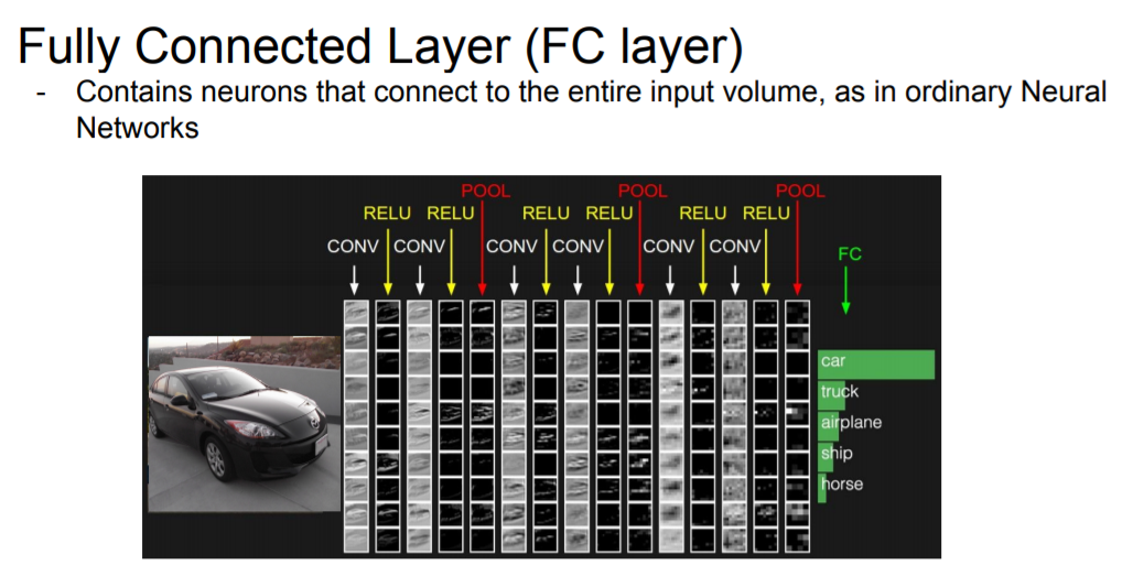 FC Layer는 마지막에 존재한다. 마지막 Conv Layer의 출력은 3차원 volume으로 이루어진다. 이 값들을 전부 펴서(stretch) 1차원 벡터로 만들고 FC Layer의 입력으로 사용한다. 그렇게 되면 Conv Net의 모든 출력을 서로 연결하는 것이다. 마지막 Layer부터는 공간적 구조(spatial structure)를 신경쓰지 않아도 된다. 전부 다 하나로 통합시키고 최종적인 추론을 하면 Score가 출력된다.