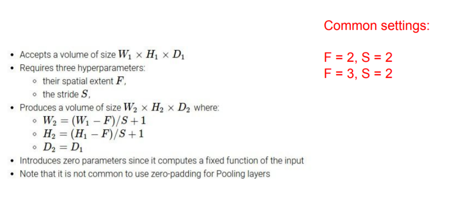 Pooling Layer에는 몇가지 디자인 초이스가 있는데, 입력이 W(width), H(Height), D(Depth) 이면 이를 통해 Filter Size를 정해줄 수 있다. 여기에 Stride까지 정해주면, 앞서 Conv Layer에서 사용했던 수식을 그대로 이용해 출력값을 계산할 수 있다 ((W - Filter Size) / Stride + 1). 사람들은 보통 pooling layer에서는 zero-padding를 사용하지 않는다. Pooling 할때는 padding을 고려하지 않고 그냥 downsample만 하면 된다. 가장 널리 쓰이는 필터사이즈는 2 x 2, 3 x 3 이고 보통 stride는 2로 한다.